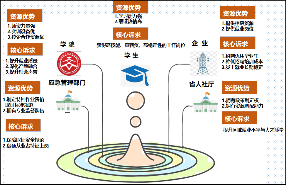 針對上述問題,學院精準識別利益相關(guān)方,通過“校政合作取證、校企合作育才、雙線協(xié)同育人”,開辟高技能、高薪資、高穩(wěn)定性的高質(zhì)量就業(yè)新賽道,為電力行業(yè)輸送優(yōu)質(zhì)高技能人才,回應(yīng)“實現(xiàn)高質(zhì)量就業(yè)”的時代命題。