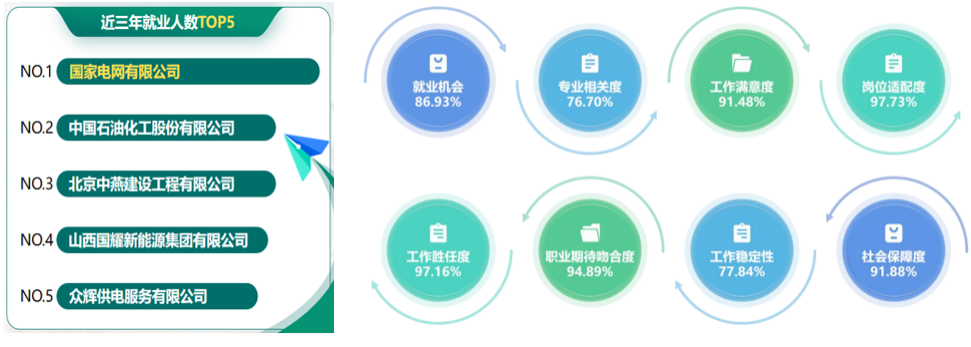 項目實施以來,學院工作質(zhì)效和學生職業(yè)技能顯著提升,高質(zhì)量就業(yè)問題得到解決。2022級學生持證率達92.18%,2024年在各類技能競賽中獲得國家級獎項10項、省級52項,持證學生成為人才市場的“香餑餑”。畢業(yè)生中,24.48%入職國企,其中累計考入國網(wǎng)公司系統(tǒng)215人(含主業(yè)109人、供服96人);75.52%入職其他企業(yè),學生工作滿意度達91.48%,高質(zhì)量就業(yè)成效凸顯。