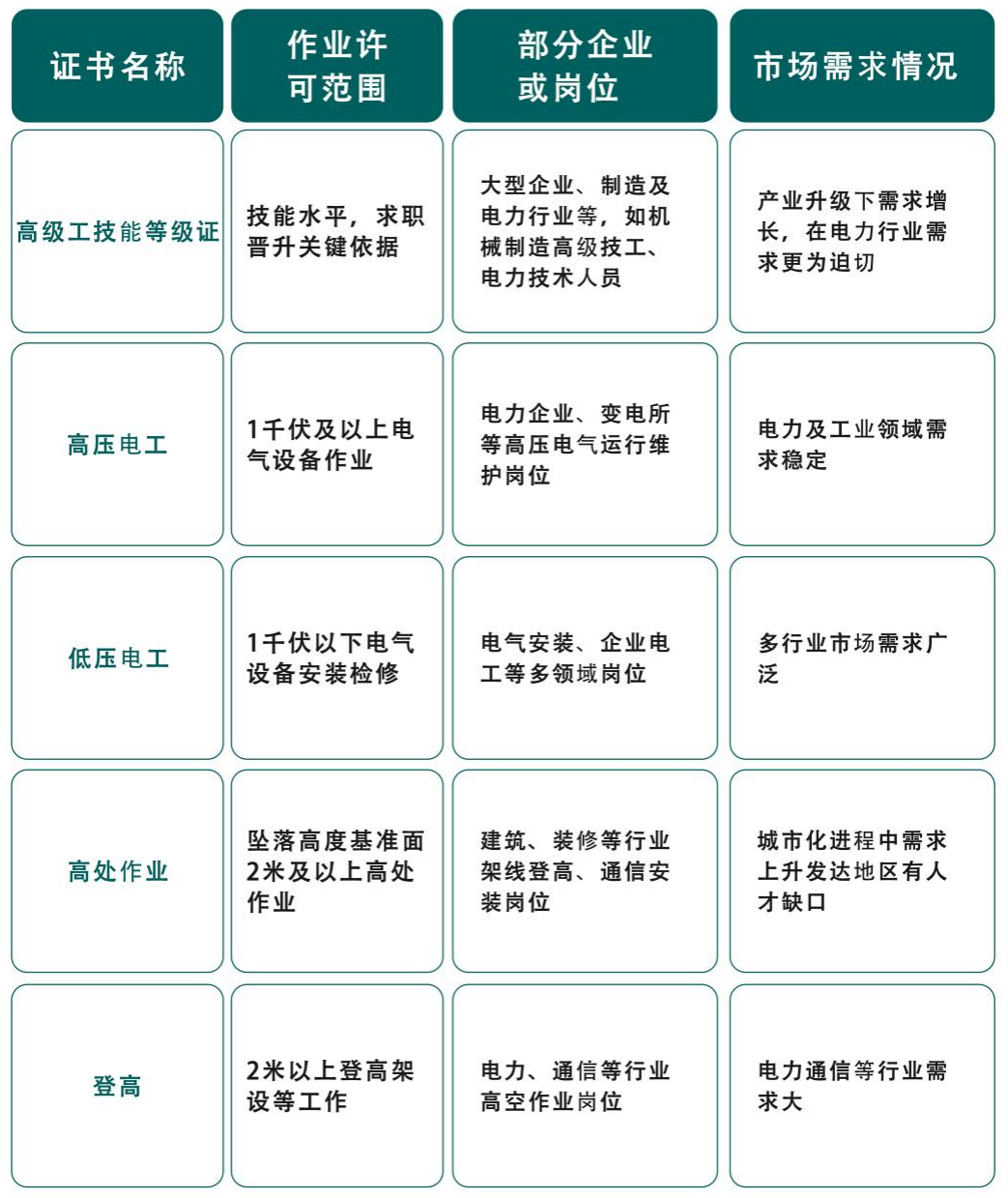1.明確“取什么證”。通過深入調(diào)研23家企業(yè)及分析省人社廳發(fā)布的電力人才需求數(shù)據(jù),精準鎖定高級工技能等級證(85%企業(yè)薪資依據(jù))、高壓電工證(電網(wǎng)作業(yè)強制要求)、低壓電工證(需求年增12%)、登高作業(yè)證(高空作業(yè)必備)、高處作業(yè)證(降低事故率60%)。這些均為國家準入類資質(zhì),覆蓋電力行業(yè)92%崗位需求和80%高危作業(yè)場景,確保學生獲得的每一項資質(zhì)都能直接提升就業(yè)競爭力和職業(yè)發(fā)展空間。