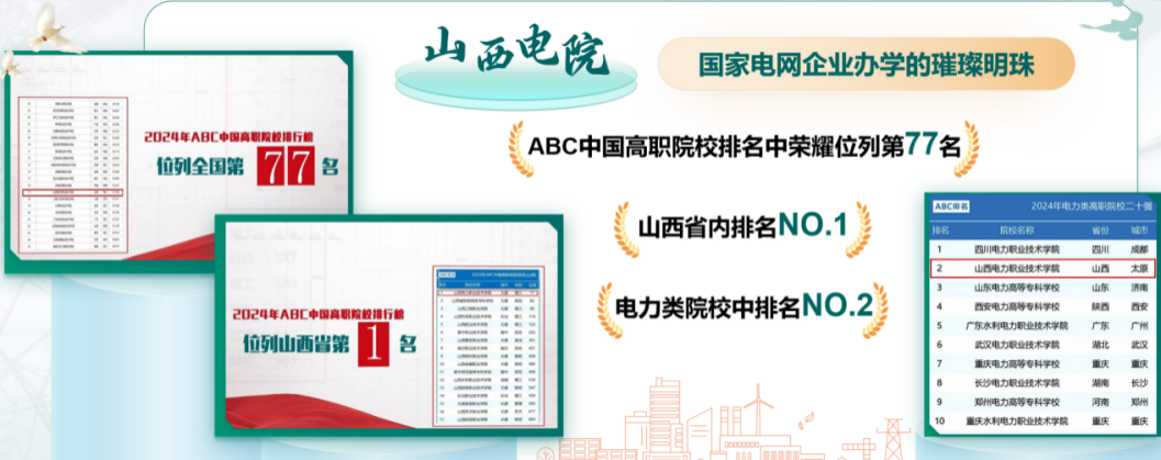 2024年ABC中國高職院校排名中,學院位列全國第77名、省內(nèi)第1名、電力類院校第2名。率先開展的“1+4”取證工作在全省51所職業(yè)院校及國網(wǎng)系統(tǒng)內(nèi)12所電力高職院校中獨樹一幟,形成可復(fù)制的高職高質(zhì)量就業(yè)“電院方案”,彰顯國網(wǎng)公司在教育領(lǐng)域積極履行社會責任、推動行業(yè)發(fā)展的擔當與作為。