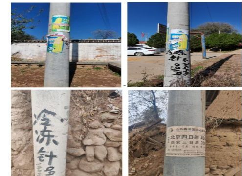 2023年,國網(wǎng)沁縣供電公司(以下簡稱“沁縣公司”)探索出利用廢舊電桿為鳥筑巢的方法,壓降在運線路跳閘率30%。這一實踐為自有電力設(shè)備資源的高效利用探索出新路徑?;诖耍?024年沁縣公司進(jìn)一步探索農(nóng)村在運電桿潛在價值釋放。經(jīng)調(diào)研,沁縣全域533個自然村,平均每個自然村有40基電桿,大約21320基電桿。60%電桿的桿體存在被亂涂亂畫、張貼小廣告等影響鄉(xiāng)村美觀的問題(如圖1),與鄉(xiāng)村振興的時代課題不相適應(yīng);5%緊貼路邊的電桿容易受外力撞擊,造成桿體破損,形成安全隱患;95%以上電桿桿體缺乏管理,電桿下端位置未被有效利用。
