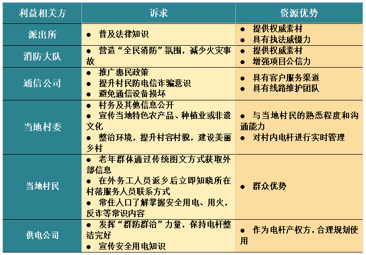 1.深挖多元訴求。向沁縣區(qū)域11個鄉(xiāng)鎮(zhèn)具有代表性的11個村發(fā)放110份“電桿新語”調(diào)查問卷,收回103份。通過收回的103份調(diào)研記錄形成初步調(diào)研方案,再通過調(diào)研方案分別同當(dāng)?shù)卮逦?、派出所?5個部門單位座談交流,全面獲取各方訴求與資源(如表1)。