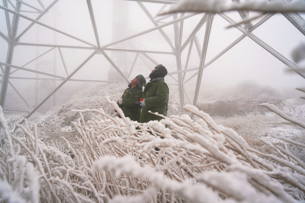12月12日,國(guó)網(wǎng)運(yùn)城供電公司員工在110千伏金古線固定觀冰哨開(kāi)展線路覆冰觀測(cè)。